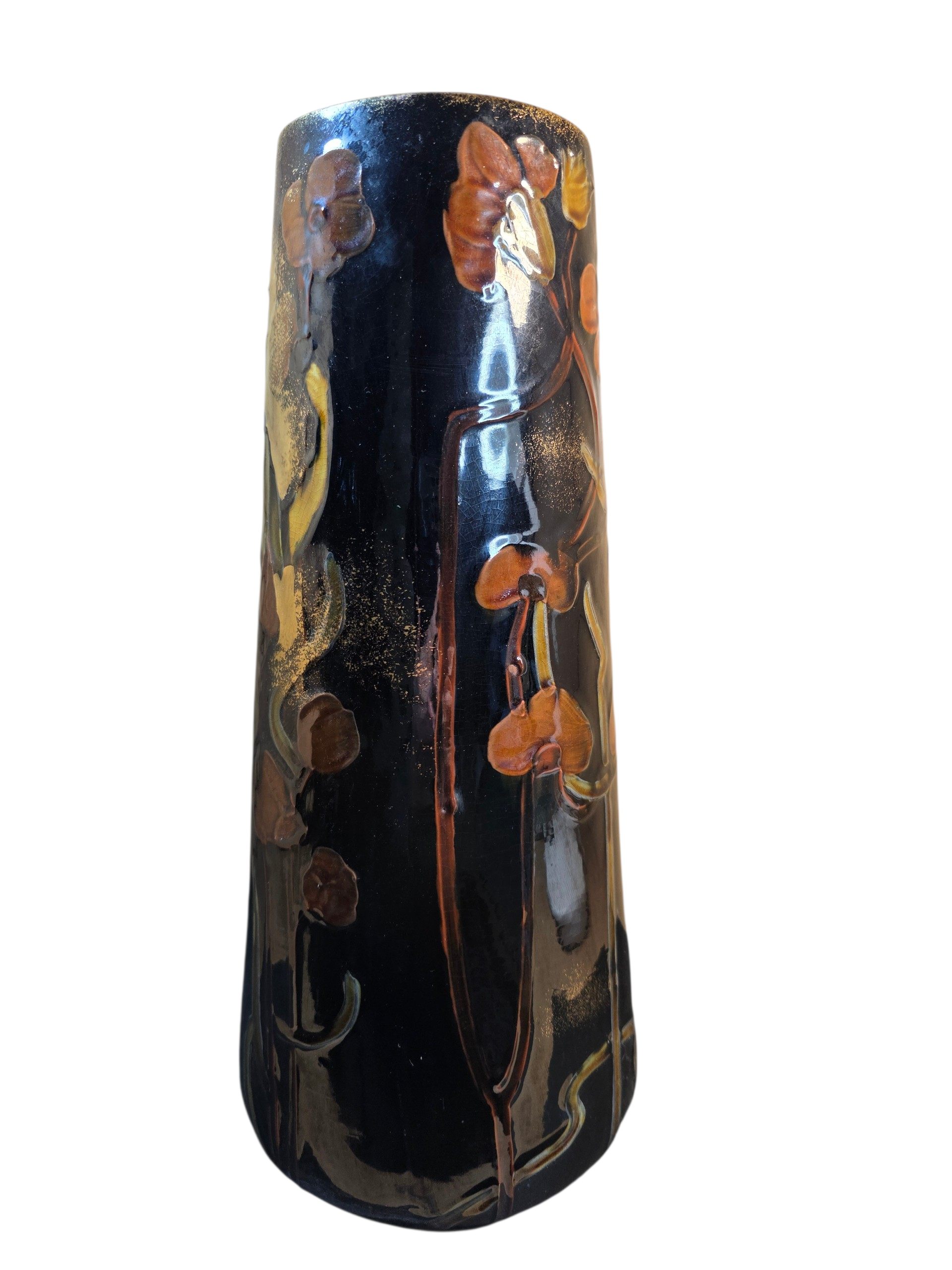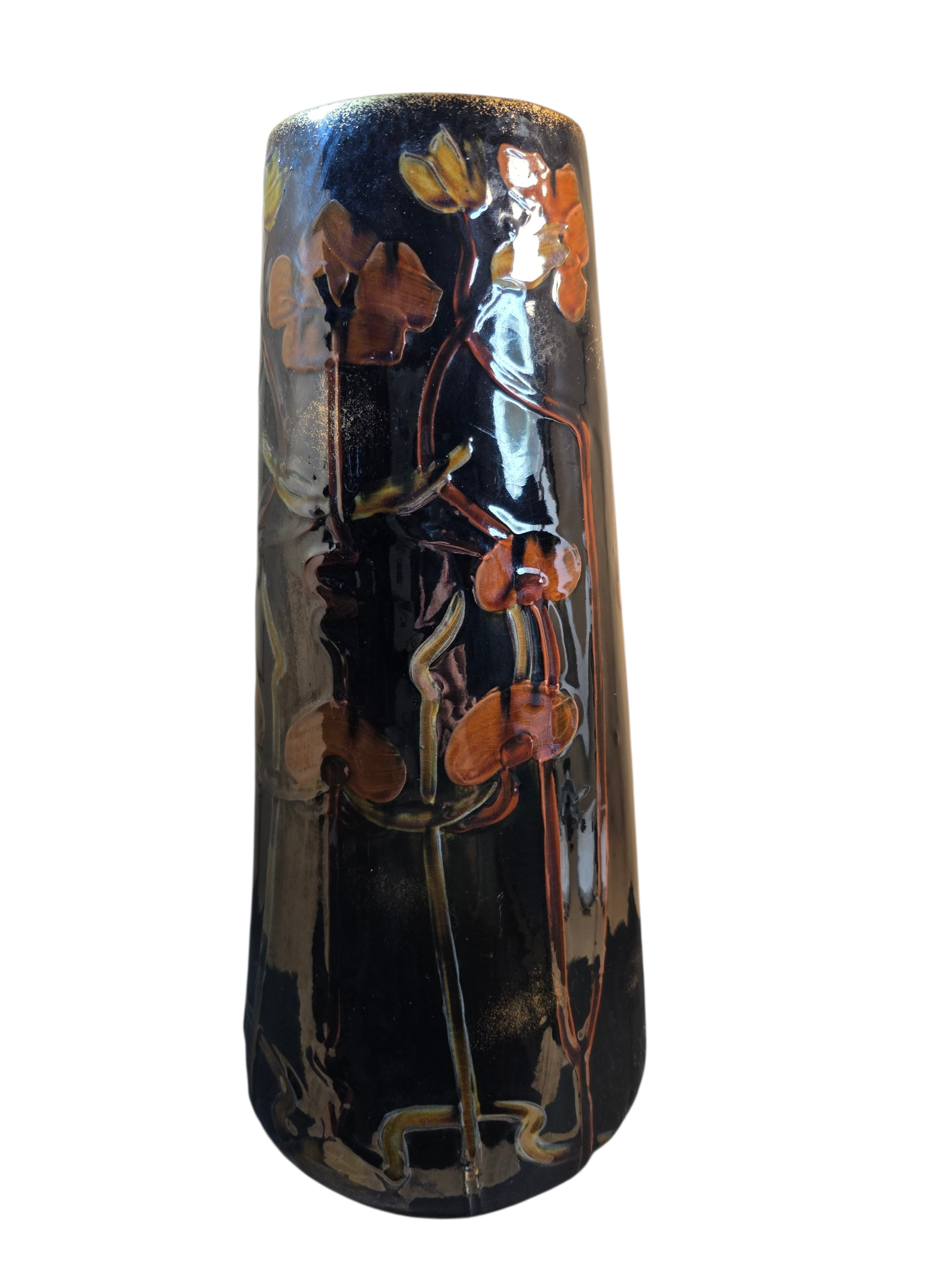 The Art Nouveau Thomas Forester Phoenix Ware Vase is a beautifully crafted ceramic piece featuring a raised maiden and flowers in an Art Nouveau style.