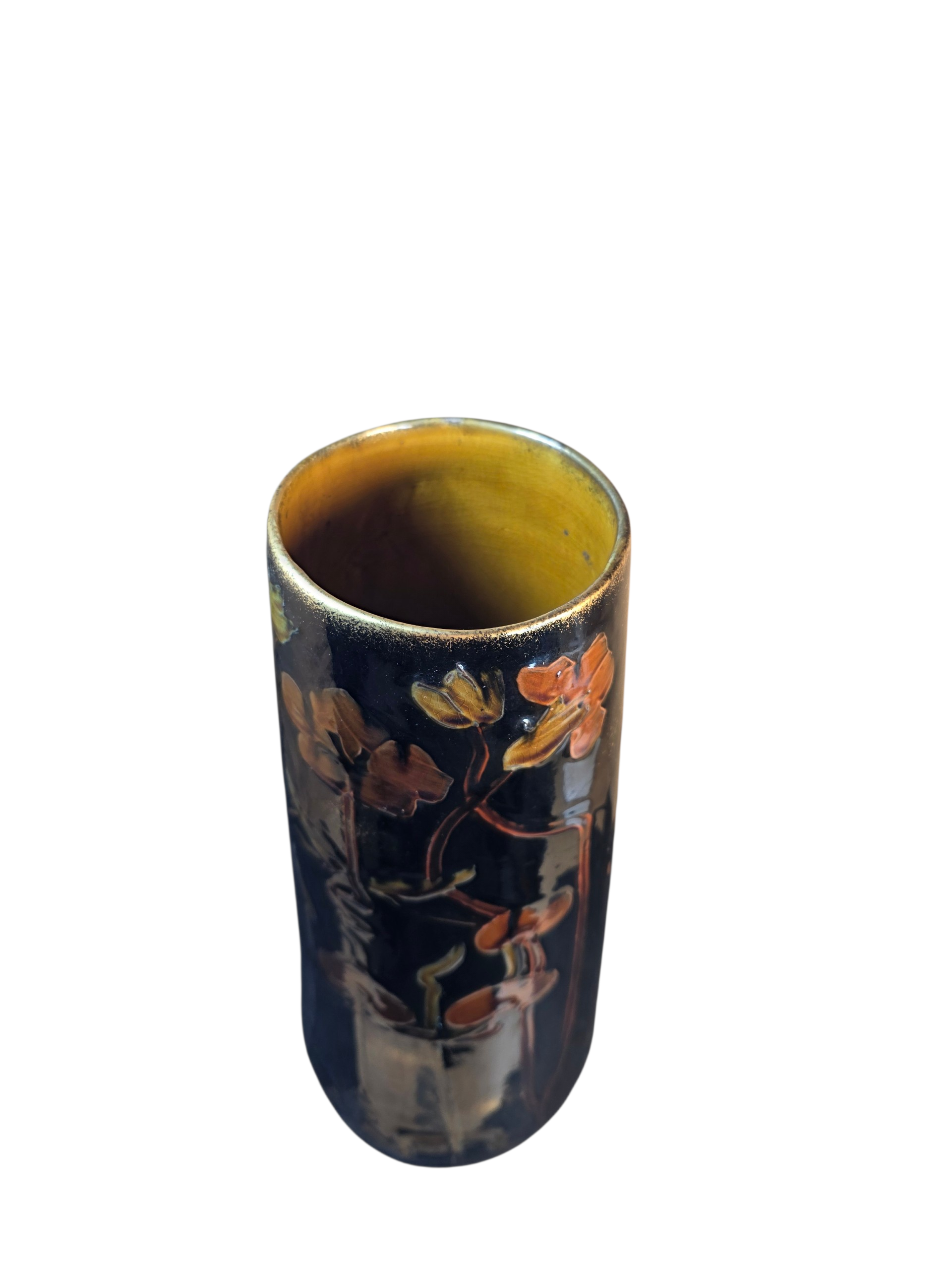 This vintage vase is handmade and showcases intricate detailing, reflecting the craftsmanship of the Art Pottery production style.